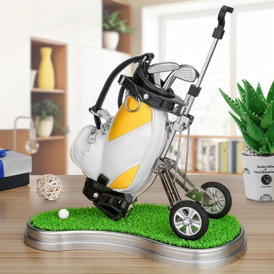 Golf Pen Holder 3 Club Pens & Movable Cart, Mini Golf Bag Desk Decor for Office, Funny Gifts for Men, Dad, Boss Stocking Stuffers for Golfers on Birthday, Christmas, Fathers Day (Yellow)
